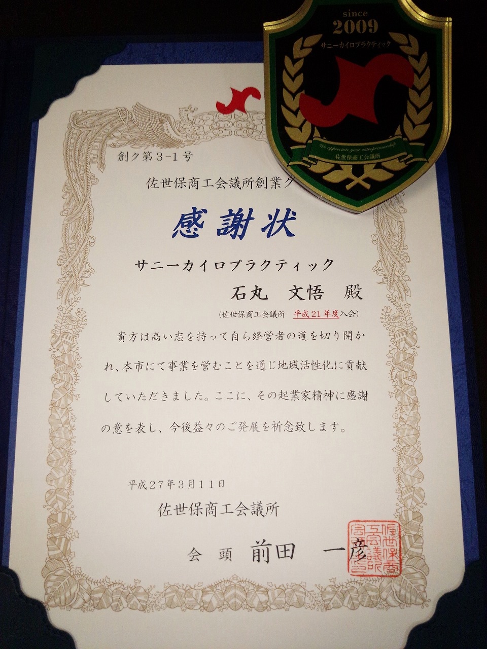 これは商工会議所の創業クラブより、創業して5年以上経った事業に送られる賞です。